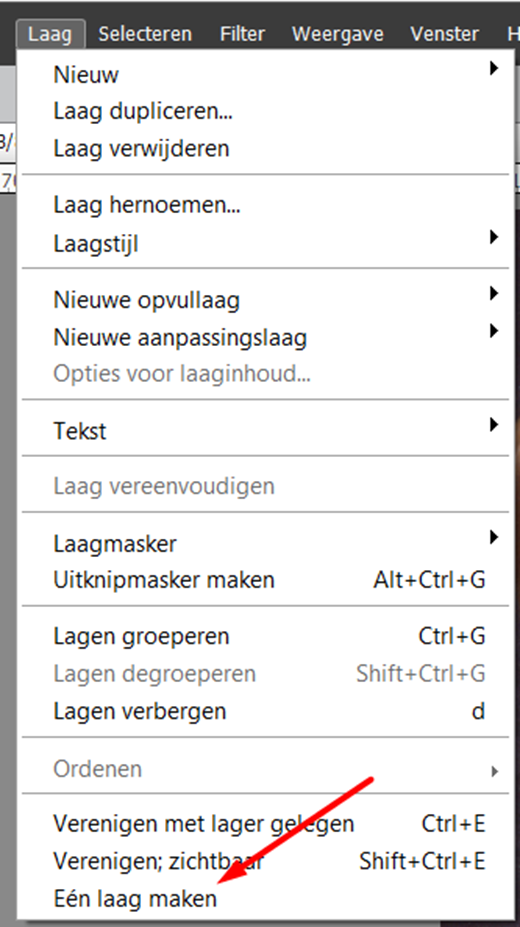 Als je (echt) klaar bent met de bewerking in lagen, dan kun je alle lagen samenvoegen tot één laag. Dat doe je via het menu <Laag>
