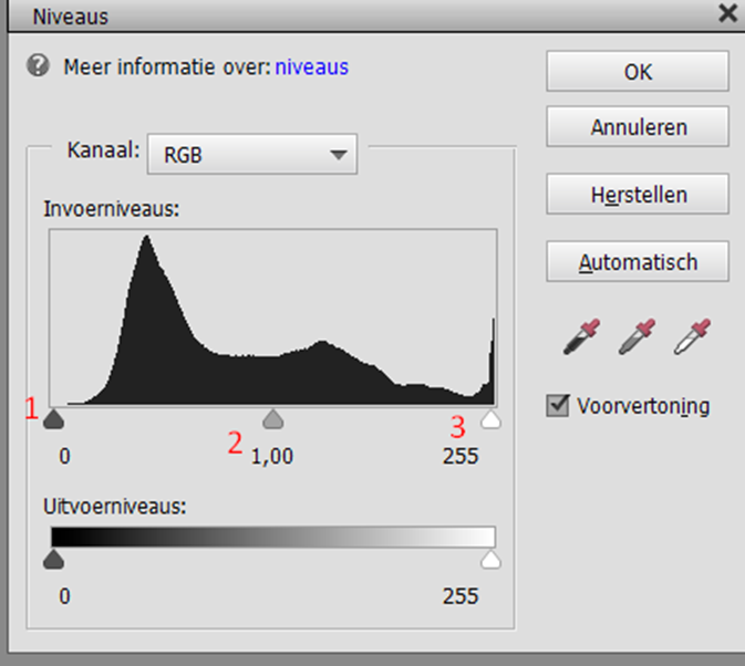 Belangrijk: gebruik de Alt-toets in combinatie met de driehoekjes 1 (foto moet dan wit zijn), 3 (foto moet dan zwart zijn) en 2 (gehele kleurstelling foto)