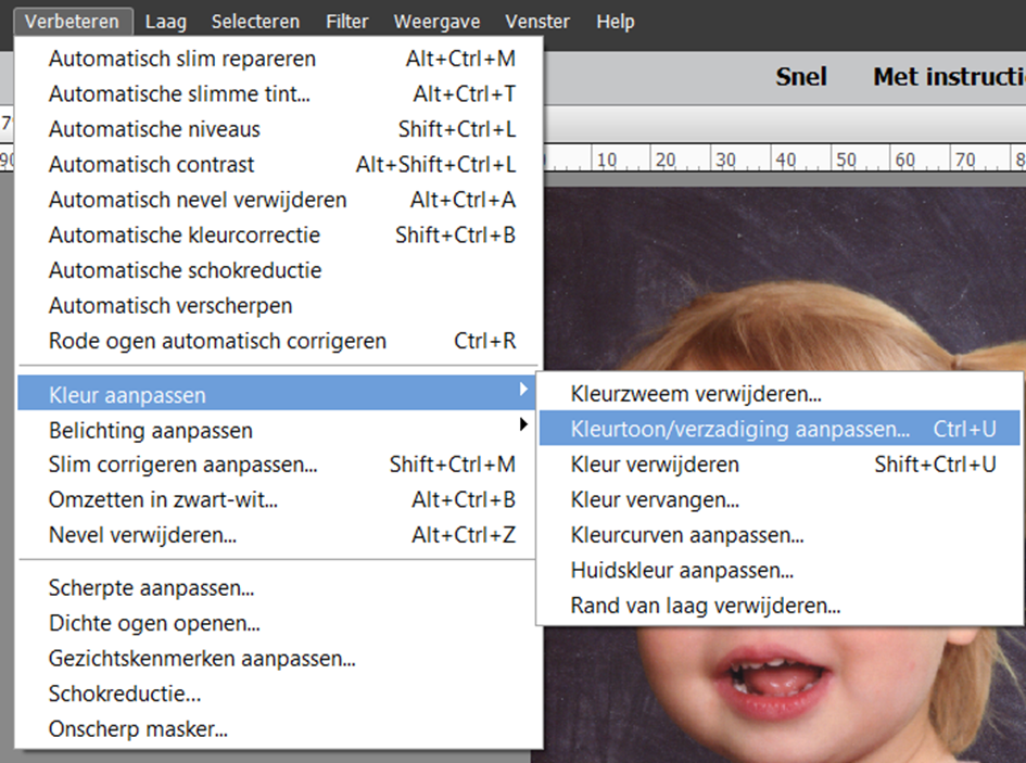 En een tweede wijziging via menu <Verbeteren> <Belichting aanpassen> ,<Kleur aanpassen> en < Kleurtoon/verzadiging>