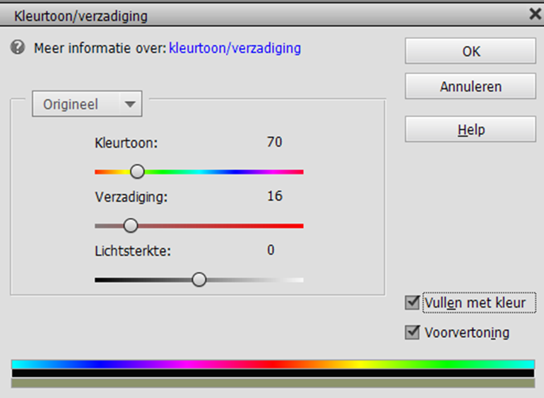 Vink het hokje <Vullen met kleur> aan en vervolgens kun je met de schuiven de kleuren naar wens instellen: