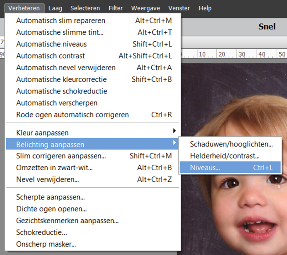 Vervolgens is (met een voorbeeldfoto) een demonstratie gegeven van een aantal verbeteracties, allereerst via het menu <Verbeteren> <Belichting aanpassen> <Niveaus>.